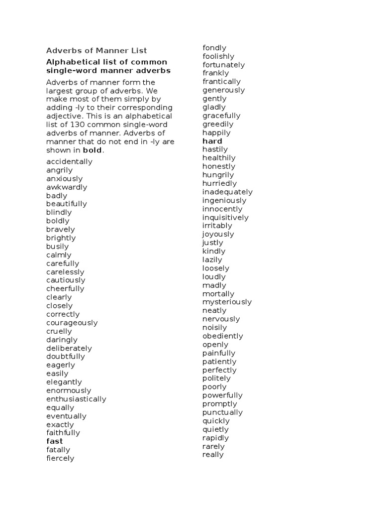 Adverbs Of Manner Liste / Positive Adverbs Of Manner List In English English Vocabs : A few adverbs of manner have the same form as the adjective :. They are usually placed either after the main verb or after the object. I'm afraid i'm not familiar with any commonly accepted classification of. Manner adverbs that modify clauses. In this chapter the adverbs of manner in english will be explained. Definition from wiktionary, the free dictionary.